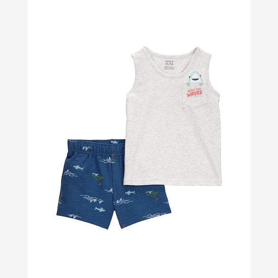 Uma ótima pedida para os papais e mamães de primeira viagem, Conjunto curto bebê 3 peças leterring mescla bege | Carter's é perfeito para deixar seu bebê mais lindo. Confeccionado em ribana de algodão, o conjunto vem uma regata e e uma bermuda com cós de elástico estampada com a mesma temática Tubarãozinho. Aproveite!